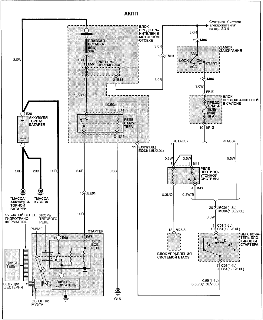 ЭЛЕКТРОСХЕМА СИСТЕМЫ ПУСКА ДВИГАТЕЛЯ (МОДЕЛИ С АКПП)