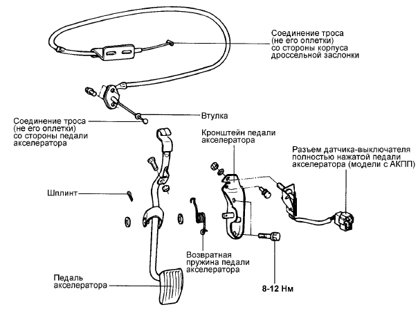 Момент затяжки Болты крепления кронштейна педали акселератора : 8 - 12 Нм 3. Надежно установите пластиковую втулку троса педали акселератора на конец рычага педали акселератора.