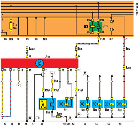 N30 – форсунка 1-го цилиндра; N31 – форсунка 2-го цилиндра; N32 – форсунка 3-го цилиндра; N33 – форсунка 4-го цилиндра; N71 – клапан стабилизации холостого хода; J169 – блок управления Digifant; J176 – реле стабилизации частоты вращения холостого хода; G39 – лямбда-зонд