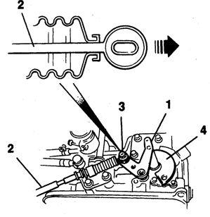 4. Отверните гайку, достаньте скобу оболочки троса и отсоедините трос от селектора.